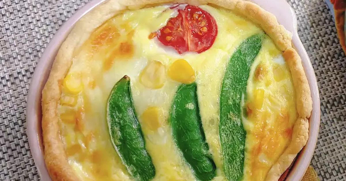 スナップえんどうとミニトマトで可愛いお花を描いたミニキッシュ。タルト型を使わず小さめの耐熱皿で作ります。食卓に並べると彩りが華やかで可愛い♪